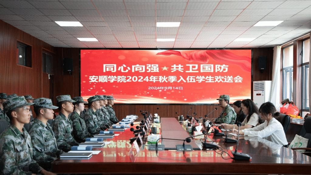 9月14日,安顺学院举行2024年下半年入伍新兵欢送仪式,为即将开启军旅新征程的优秀学子送行。党委书记罗荣彬书面向入伍学生表示祝贺、提出希望,校长曾丽,校党委委员、副校长殷红敏出席并讲话。入伍学生和武装部相关人员等参加欢送仪式。