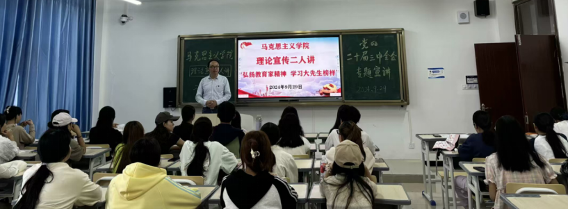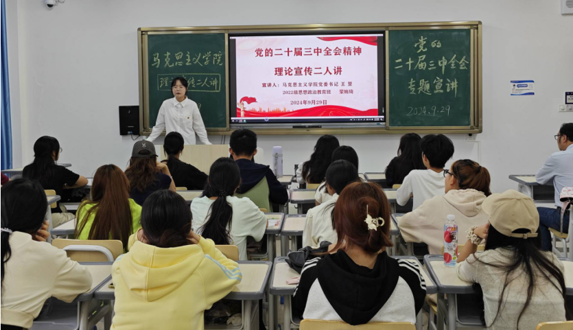 为深入学习贯彻党的二十届三中全会精神,弘扬教育家精神,马克思主义学院于2024年9月30日下午在乐学楼505教室成功举办了党的二十届三中全会精神“理论宣传二人讲”活动。本次活动由马克思主义学院学生党支部精心组织,旨在引导学院学生坚定理想信念,树立为强国复兴作出贡献的责任担当。