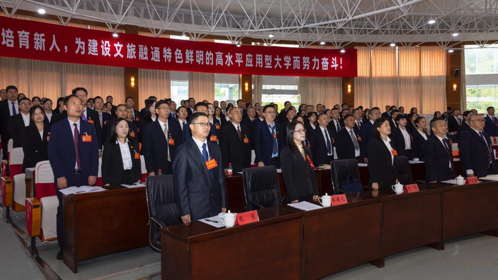 大会的主题是:高举中国特色社会主义伟大旗帜,以习近平新时代中国特色社会主义思想为指导,深入学习贯彻党的二十大和二十届二中、三中全会精神,全面落实习近平总书记在贵州考察时的重要讲话精神和省委围绕“四新”主攻“四化”决策部署,坚持社会主义办学方向,落实立德树人根本任务,全面开启建设文旅融通、特色鲜明的高水平应用型大学新征程!