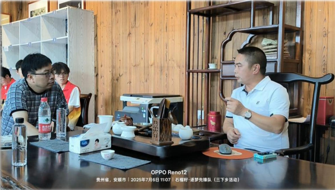 我们围绕苗族文化的传承与发展展开了深入的探讨。苗族的历史和文化传统丰富多彩,其独特的文化和习俗如跳花灯、蜡染等,更是中华民族文化宝库中的瑰宝。跳花灯时,舞者们步伐轻盈,动作优美,在欢快的节奏中展现出苗族人民对生活的热爱;蜡染工艺则以其独特的图案和精湛的技艺,诉说着苗族人民的智慧和审美。然而,而在和安顺市开发区苗学会的杨会长交流的过程中我们发现,在现代社会的快速发展下,这些珍贵的文化遗产面临着诸多挑战,其在现代生活中的地位也受到一定冲击。并且据杨会长表示:苗族在民族发展的历史进程中可能形成过自己的文字,但随着民族的迁移过程中,逐渐消失,文化传承在现阶段仅依靠口口相传。因而,许多珍贵的文化记忆,苗族的语言传承,面临随着时间流逝而消逝的风险,正因如此马克思主义学院综合教研室主任翟晓芳老师在讨论中提出,可以将苗族文化通过文字和音频视频形式记录下来,这对于保护苗族文化以及促进民族融合至关重要。