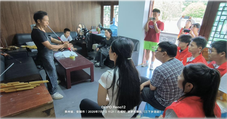 在中华文化的璀璨星河中,每一项非遗都是闪耀千年的珍贵星辰。为深入挖掘非遗文化的时代价值,让传统技艺在当代焕发新生,我们满怀敬畏与期待,2025年7月7日上午,在翟晓芳、罗宪志两位指导老师的带领下,再次奔赴安顺市三合苗寨开展“三下乡”实践活动,拜访了非遗文化传承人——杨小东老师,由此开启了一段触摸芦笙文化、传承民族智慧的深度探寻之旅。