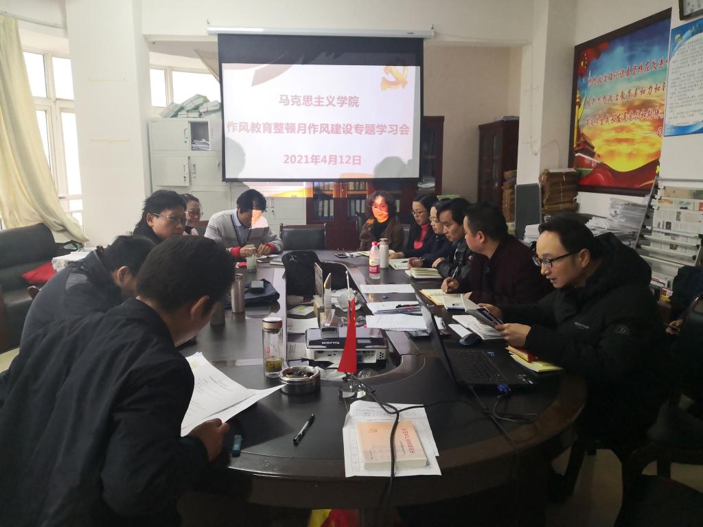 2021年4月12日下午马克思主义学院召开了作风教育整顿月作风建设专题学习会议。会议由马克思主义学院党委书记王罡主持,马克思主义学院全体党员教师出席会议。