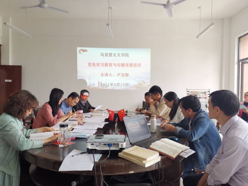 为深入学习贯彻习近平总书记在党史学习教育动员大会上的重要讲话精神和全校党史学习教育、三级书记讲党课的相关要求,扎实有效开展党史学习教育,2021年5月17日下午,马克思主义学院开展党史学习教育宣讲和专题党课活动,此次活动由马克思主义学院党委委员、副院长、教师党支部书记卢玉琳同志主讲,全体党员教师聆听了专题党课。