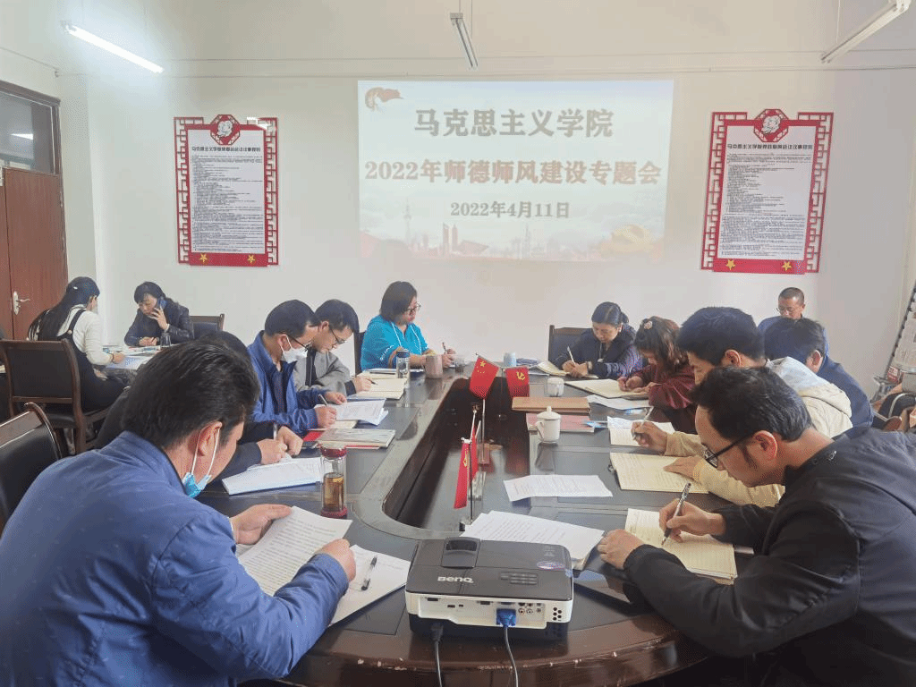 2022年4月11日,马克思主义学院召开2022年师德师风建设专题会,会议主题为“强化党建引领,打造四有、六要思政课教师队伍”,就进一步贯彻落实安顺学院党风廉政建设和反腐败工作协调小组师德师风专题会议精神进行安排部署。马克思主义学院全体思政课教师参会。会议由马克思主义学院专职副书记潘光才同志主持。