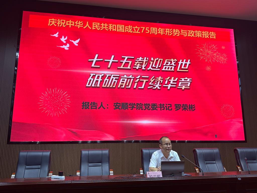 为庆祝中华人民共和国成立75周年,回顾展示新中国建设的辉煌成就,进一步激励和鼓舞当代大学生更加紧密团结在以习近平同志为核心的党中央周围,增强“四个意识”、坚定“四个自信”、做到“两个维护”,立志为以中国式现代化全面推进强国建设、民族复兴伟业而努力学习,按照党中央、省委及市委部署, 2024年9月29日上午,安顺学院党委书记罗荣彬为青年大学生作庆祝中华人民共和国成立75周年形势与政策报告,报告会由马克思主义学院院长黎进深主持。