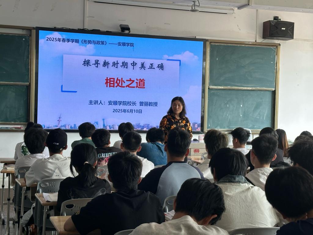 6月10日上午,安顺学院校长曾丽教授在博学楼0B22教室给24级计算机两个班的青年大学生作形势与政策报告。