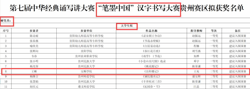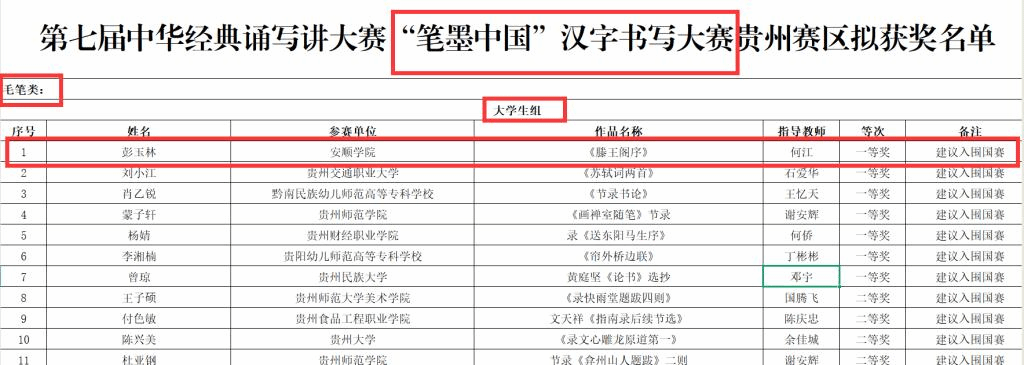 在“笔墨中国”汉字书写大赛贵州赛区复赛中,马克思主义学院彭玉林同学的作品《滕王阁序》获大学生组毛笔类一等奖第一名,并入围国赛。马克思主义学院王晰同学的作品《岳阳楼记》获大学生组硬笔类二等奖第一名,并入围国赛。