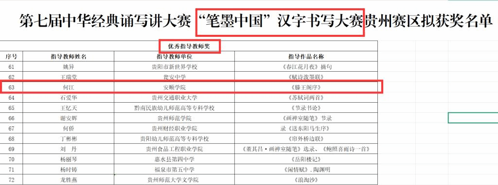 在“笔墨中国”汉字书写大赛贵州赛区复赛中,马克思主义学院教师何江荣获优秀指导教师奖。