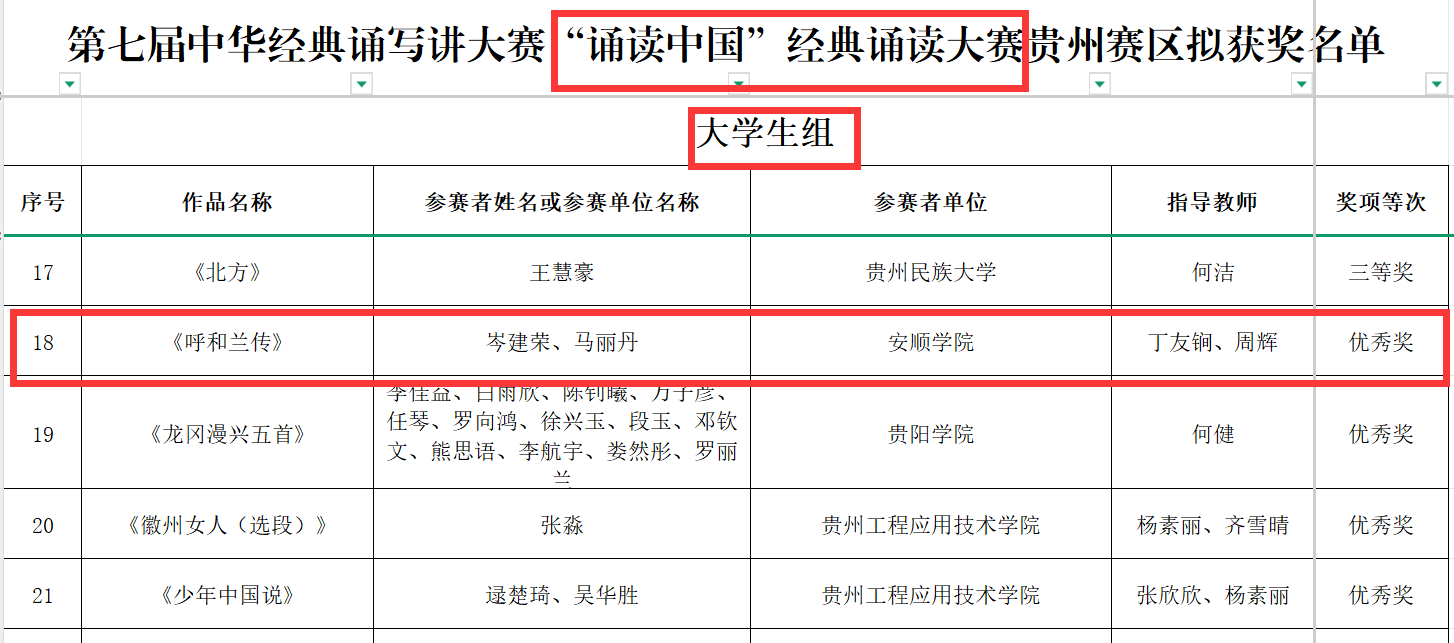 在“诵读中国”经典诵读大赛贵州赛区复赛中,马克思主义学院岑建荣同学参与的作品《呼和兰传》获大学生组优秀奖第一名。