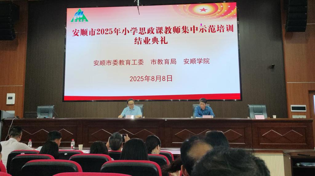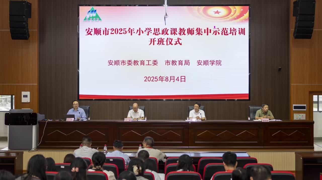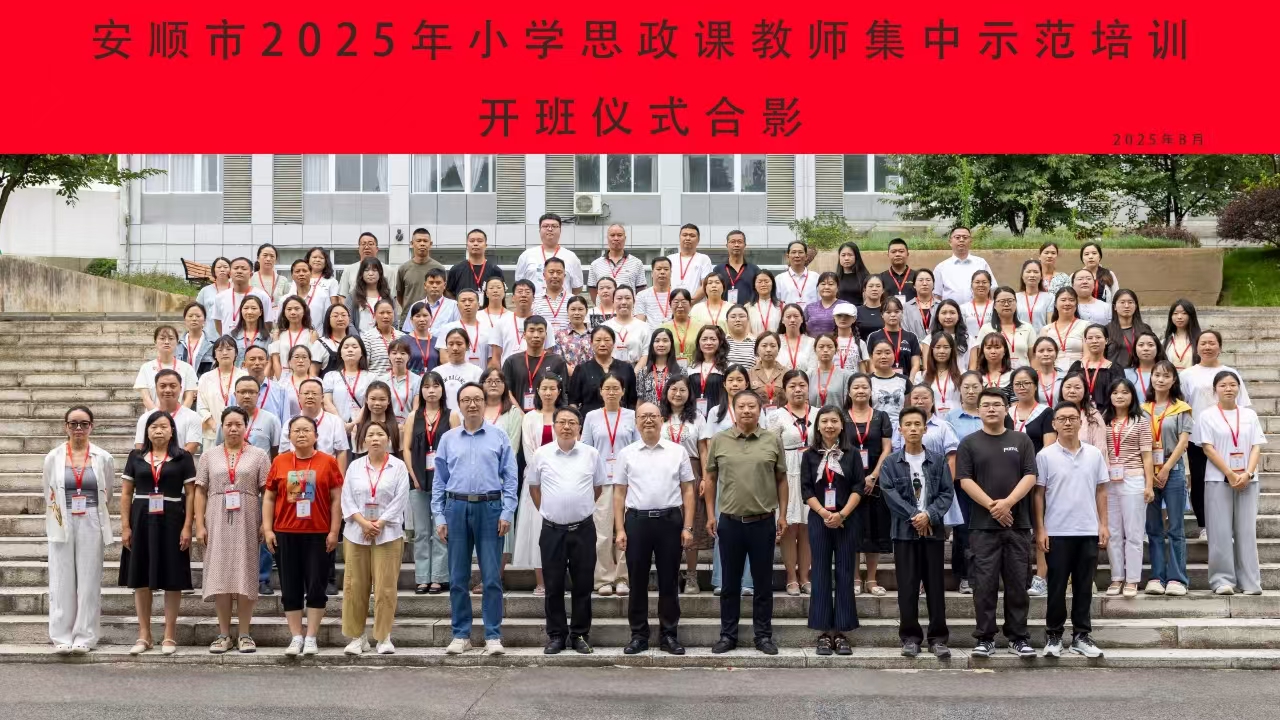 2025年8月4日至8日,安顺学院马克思主义学院承办的安顺市2025年小学思政课教师集中示范培训在安顺学院圆满举行。安顺市委教育工委、市教育局领导,安顺学院校领导出席了开班仪式和结业典礼。来自西秀区、平坝区、普定县、镇宁县、关岭县、紫云县、经开区、黄果树和市实验学校的100名全市小学阶段优秀思政课教师代表参加培训。