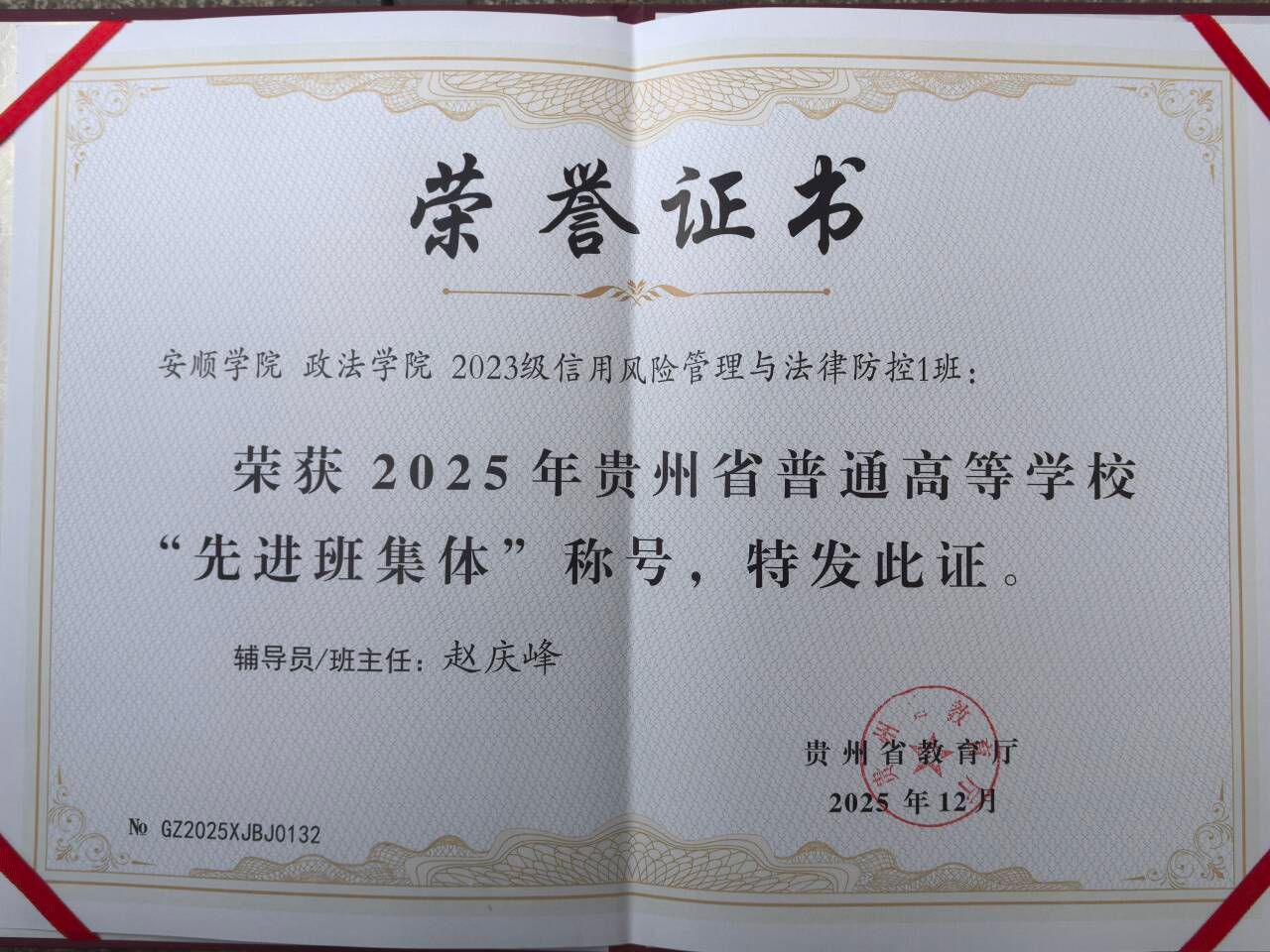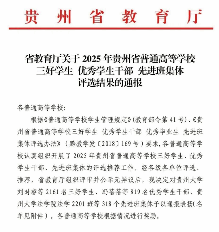 近日,贵州省教育厅公布2025年贵州普通高等学校三好学生、优秀学生干部、先进班集体评选结果,我院“2023级信用风险管理与法律防控1班(班主任:赵庆峰)”榜上有名。