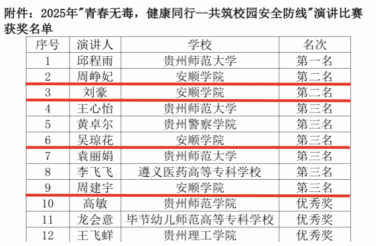 近日,由中共贵阳市委社会工作部等部门联合主办的2025年“青春无毒,健康同行——共筑校园安全防线”演讲比赛在贵州师范大学圆满落幕。安顺学院马克思主义学院四名学子凭借出色表现,共荣获第二名两项、第三名两项,获奖等次和人数位居全省高校前茅,展现了安顺学院大学生扎实的学识素养与昂扬的青春风貌。