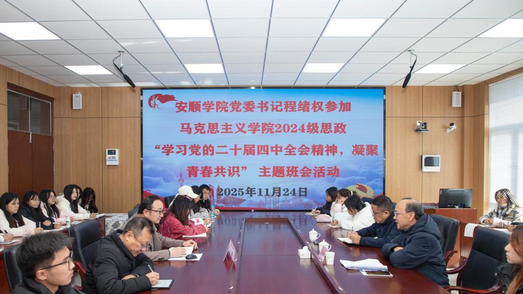 为深入学习贯彻党的二十届四中全会精神和进一步加强学校领导下沉青年大学生学习生活一线工作,2025年11月24日,安顺学院党委书记程绪权为2024级思政班学生上形势与政策课并参加了主题班会活动。