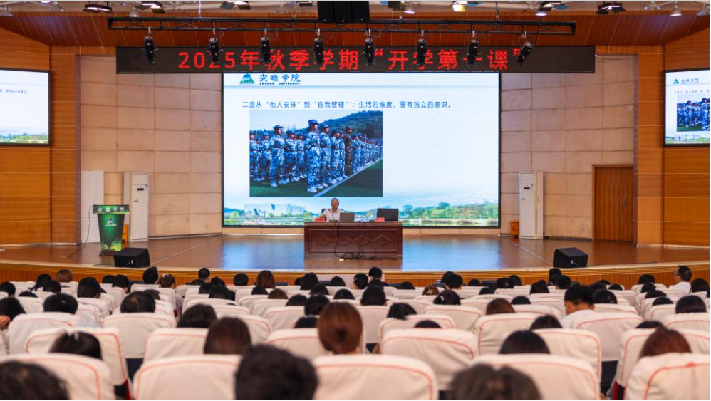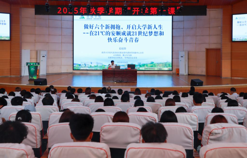 2025年9月8日上午,南开大学现代旅游业发展省部共建协同创新中心主任、A1岗教授、博士生导师、安顺学院名誉校长石培华,安顺学院党委书记程绪权、校长曾丽在学术报告厅为全校师生代表700余人讲授2025年秋季学期“开学第一课”。曾丽主持授课。授课中,石培华以“做好六个新拥抱,开启大学新人生——在21℃的安顺成就21世纪梦想和快乐奋斗青春”为题授课。石培华围绕拥抱安顺、拥抱贵州、拥抱大学、拥抱文旅、拥抱变化、拥抱时代六大维度,既有高屋建瓴的科学理论,又有生动具体的典型案例,为同学们规划大学生活提供了清晰的指引。