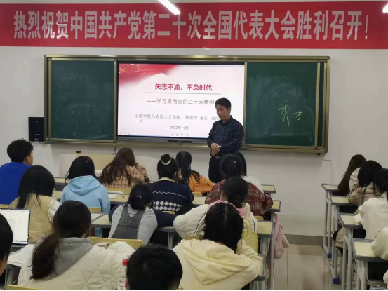 2022年11月28日晚上,马克思主义学院院长黎进深在乐学楼503室开展题为《学习贯彻党的二十大精神——矢志不渝 不负时代》专题宣讲。马克思主义学院2022级思想政治教育班全体同学聆听了宣讲报告。