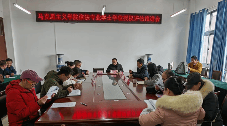 为扎实有序推进马克思主义学院信用风险管理与法律防控专业学士学位授权评审准备工作,确保各项迎评任务落实落细,马克思主义学院于2026年1月12日下午两点半在学院会议室组织召开“马克思主义学院信法专业学士学位授予权评审准备工作推进会”。会议由马克思主义学院王罡书记主持,学院领导、各科室负责人、以及信法专业全体教师参加了会议。