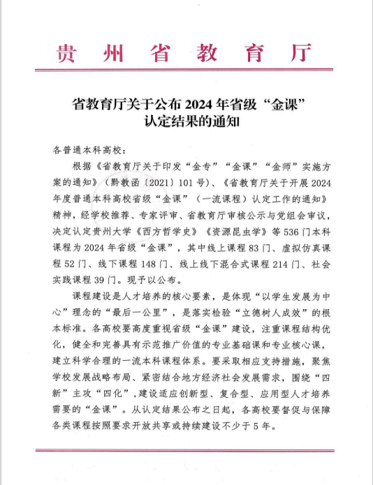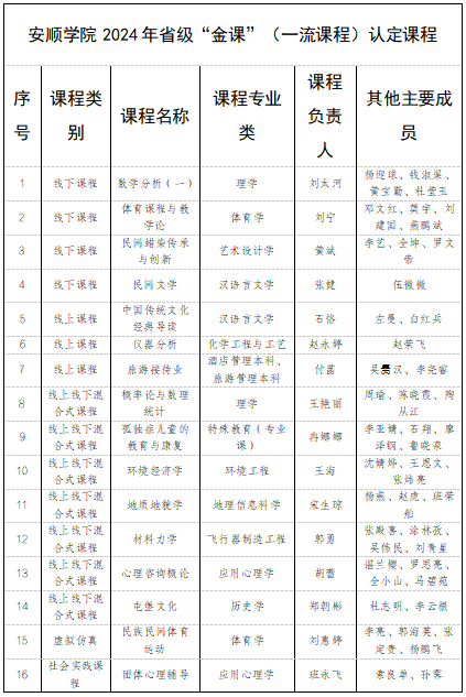 近日,贵州省教育厅公布了《2024年省级“金课”(一流课程)认定结果的通知》,安顺学院16门课程获认定。其中线上一流课程3门、虚拟仿真实验教学一流课程1门、线下一流课程4门、线上线下混合一流课程7门、社会实践一流课程1门。