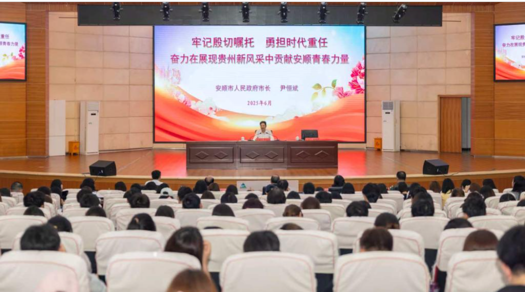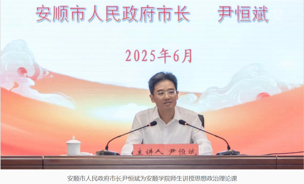 2025年6月27日下午,安顺市人民政府市长尹恒斌在安顺学院学术报告厅以“牢记殷切嘱托 勇担时代重任 奋力在展现贵州新风采中贡献安顺青春力量”为主题,为安顺学院师生讲授思想政治理论课。安顺学院党委书记程绪权,党委副书记李琳,党委委员、副校长殷红敏以及师生代表共800余人聆听学习。授课由程绪权主持。