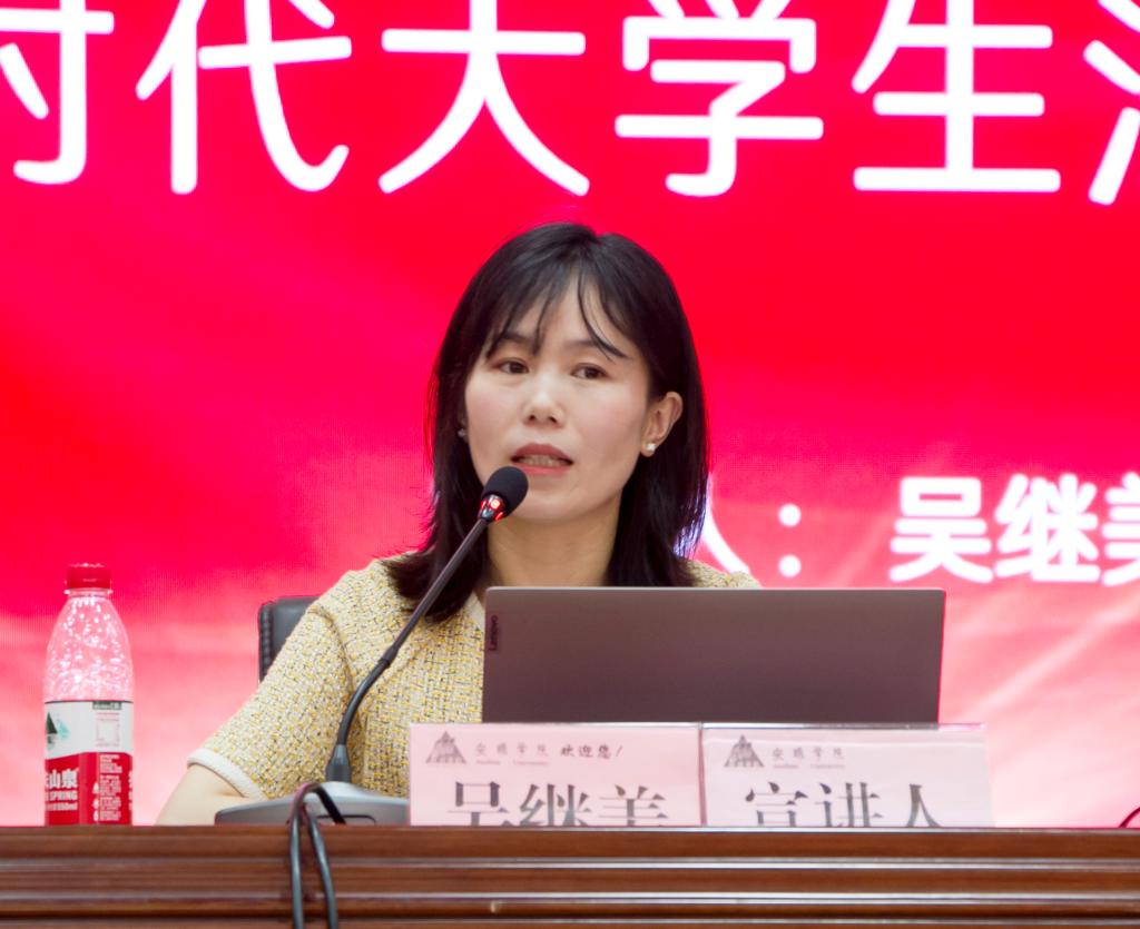 吴继美从习近平法治思想的形成及确立、习近平法治思想的核心要义、新时代推动法治进程“2021十大案件”、做尊法守法的新时代大学生四个部分,将理论知识结合实际案例,对习近平法治思想的核心要义与精神内涵进行了深入讲解和系统解读。最后,她鼓励大家要学深悟透习近平法治思想,在今后的学习与工作中德法兼修、明法笃行,在实现中华民族伟大复兴的中国梦的奋斗中书写出绚丽的人生华章。报告内容丰富,形式多样,意义重大,与会师生收获满满。